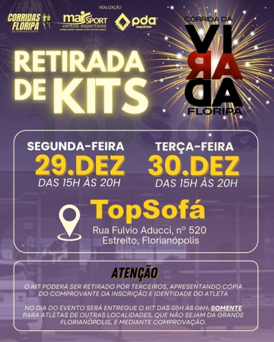 A ENTREGA DO KIT DE CORRIDA SERA REALIZADA NOS DIAS 29 E 30/12(DAS 15H AS 20H). E NO DIA DA PROVA DAS 5:00 AS 6:00 PRA ATLETAS DE OUTRAS CIDADES. LOCAL :TOP SOFA - RUA FULVIO ADUCCI, Nº 520 FUNDOS DA LOJA. |